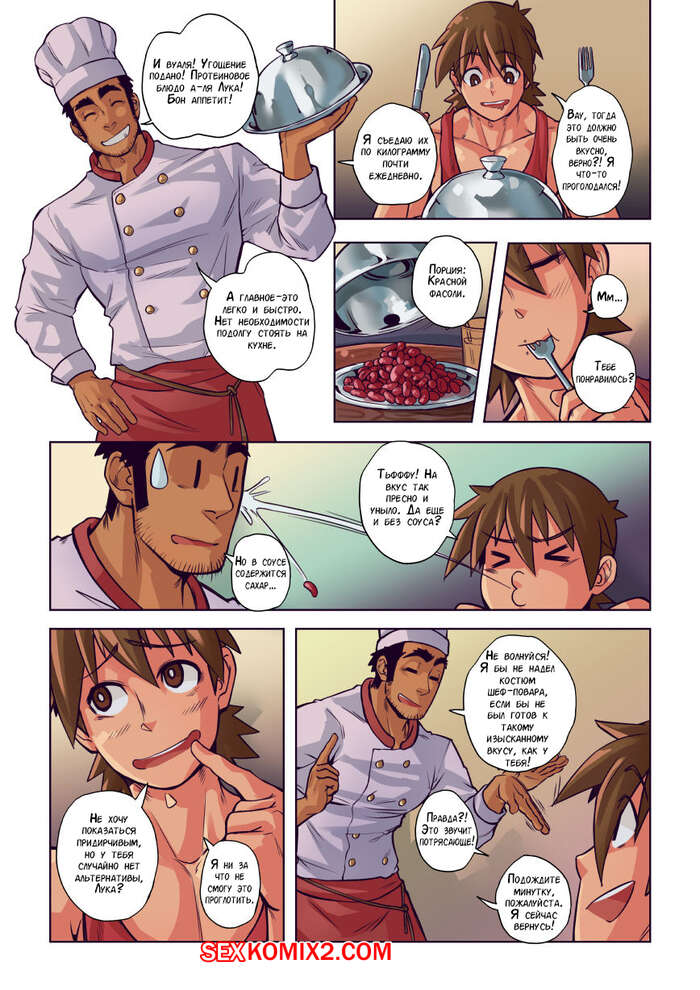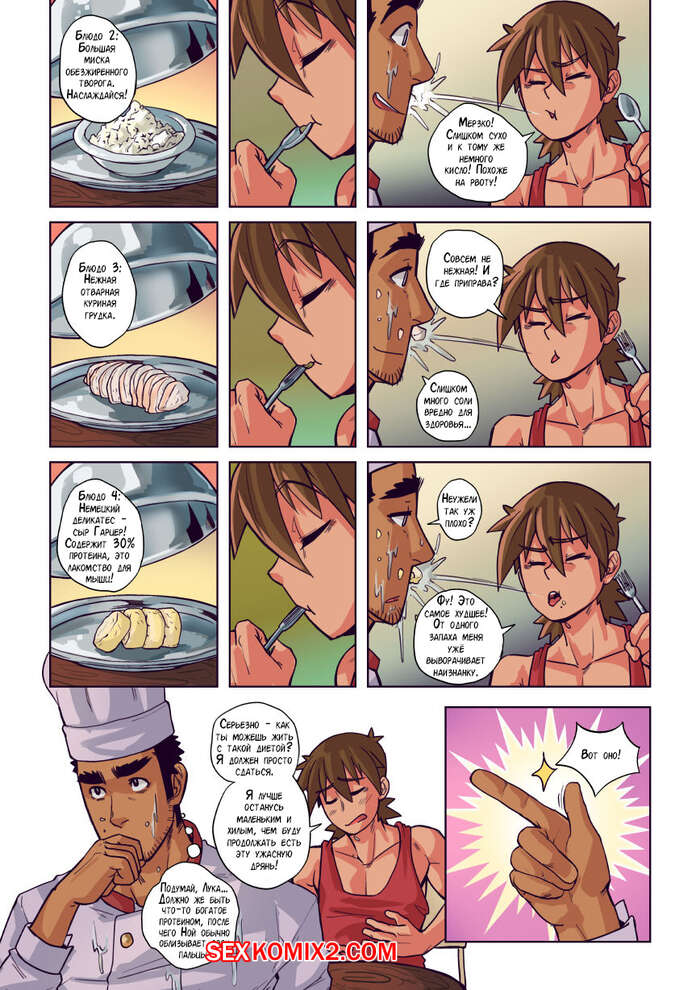 Порно комикс Вылижи тарелочку. Повар увидел, что парень не доел самое вкусное блюдо в его заведении и предложил его что-то повкуснее. свой член.